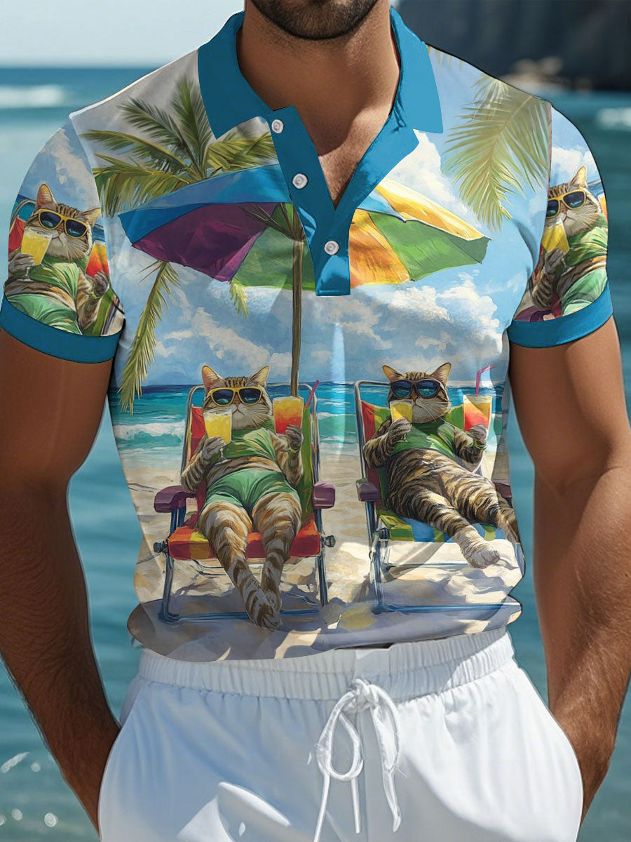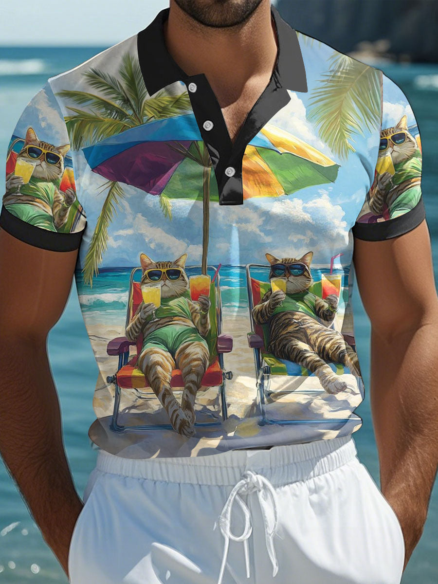 Men's Beach Cat Print Casual Polo Shirt