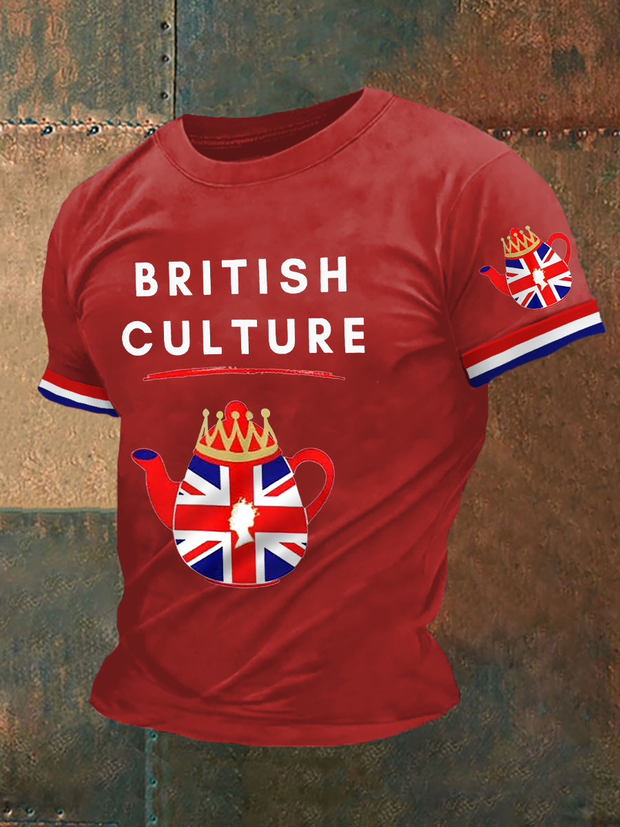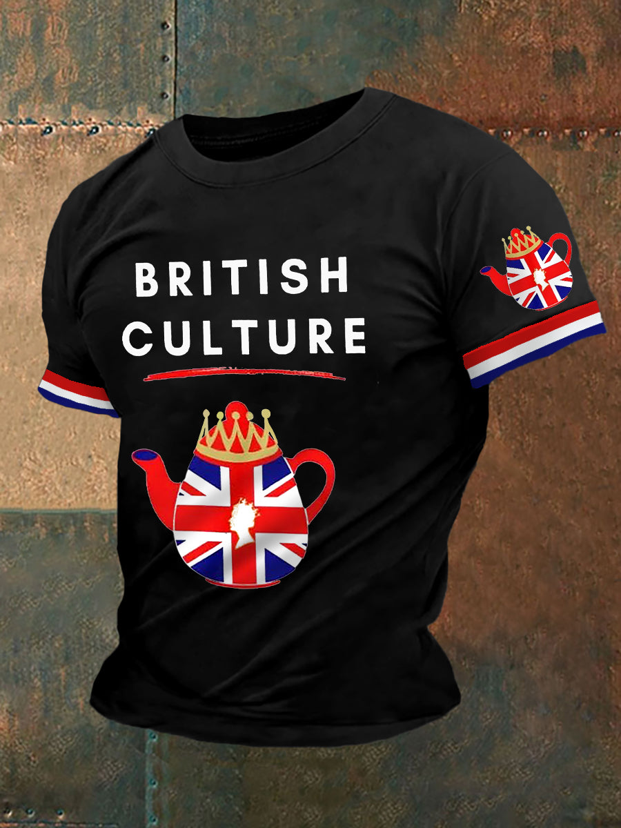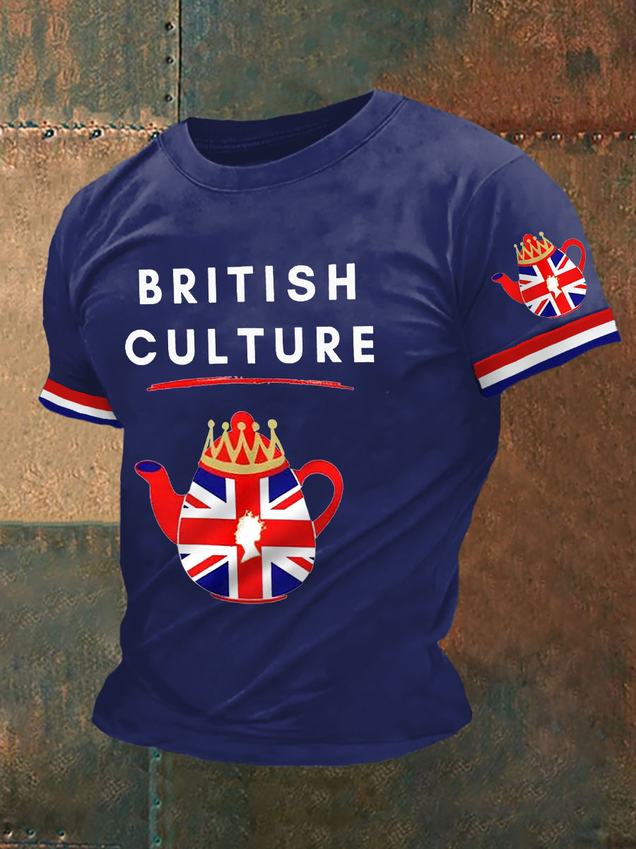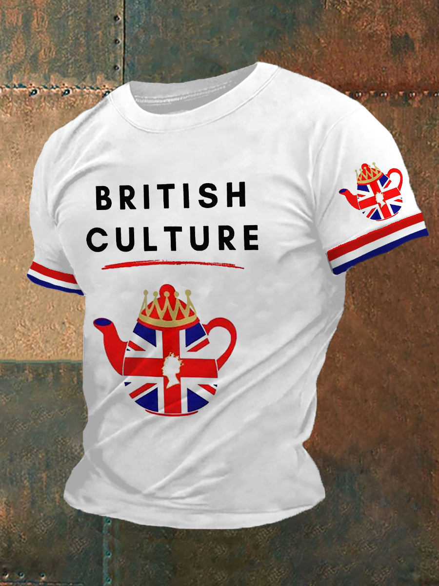 Men's British Culture Union Jack Flag Tea Pot Print Casual Tee