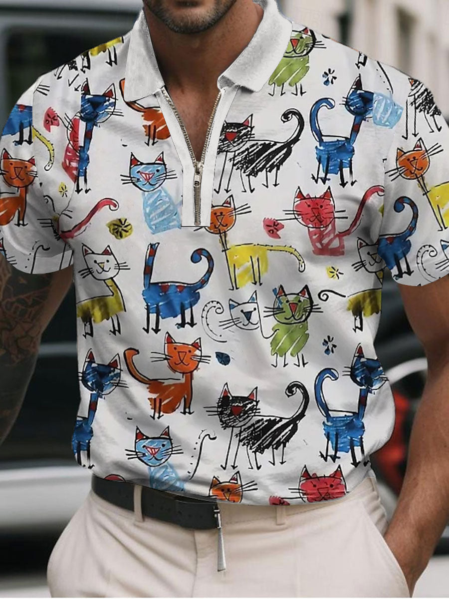 Men's Cat Art Print Casual Polo Shirt