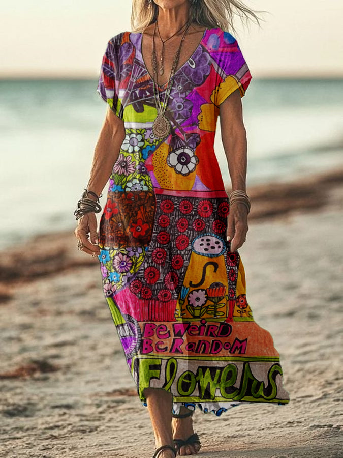 Women's Abstract Floral Art Print V-Neck Short Sleeve Cotton and Linen Dress