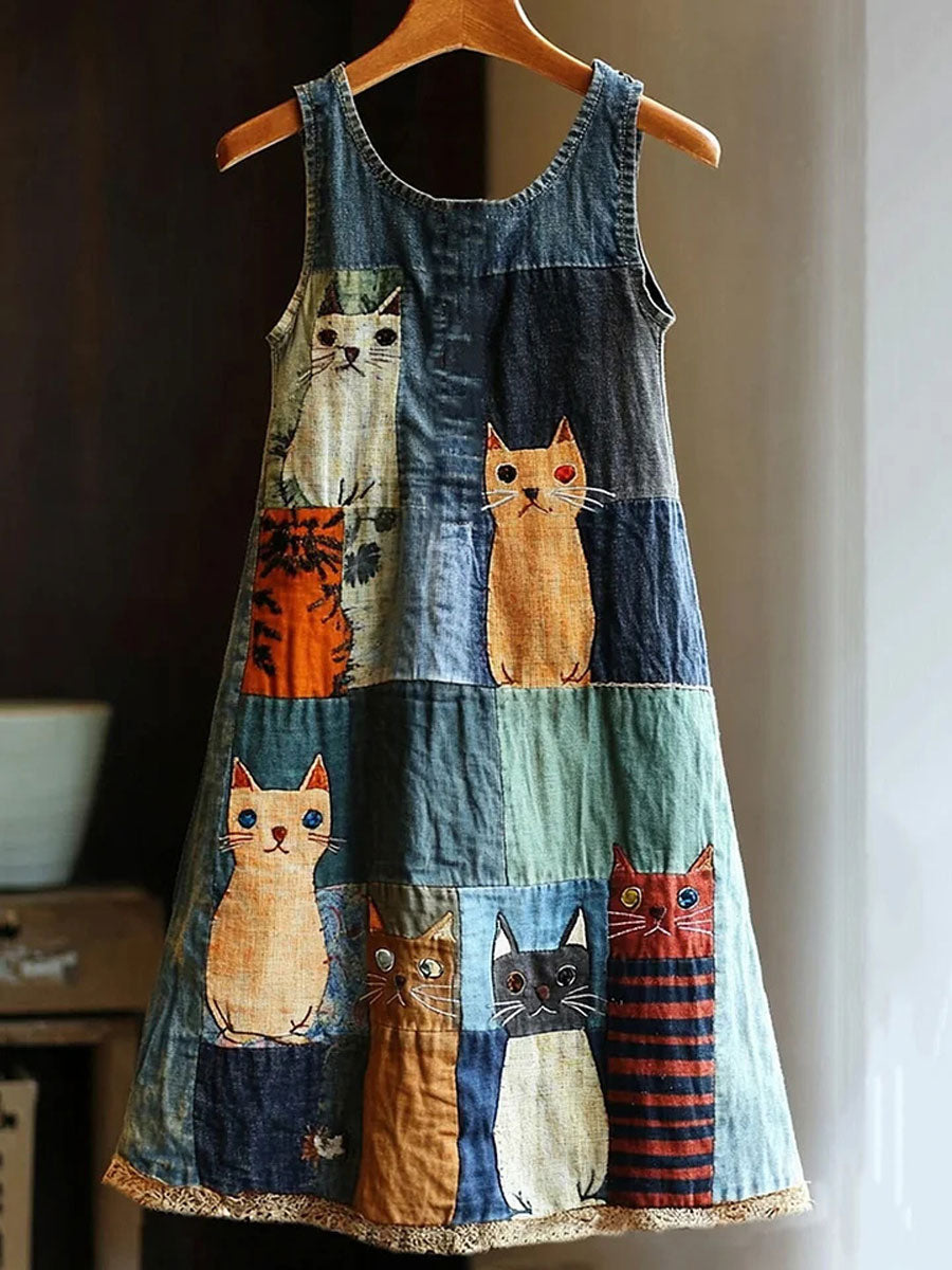 Women's Artistic Cat Patchwork Design Print Dress