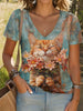 Women's Cat Art Print Casual V-Neck T-Shirt
