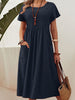 Women's Solid Color Round Neck Pocket Pleated Short Sleeve Cotton Linen Dress